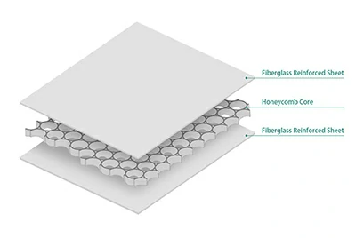 Chalco fiberglass honeycomb panels use a sandwich structure consisting of an epoxy fiberglass surface layer, an aluminum honeycomb core, and a structural adhesive system.